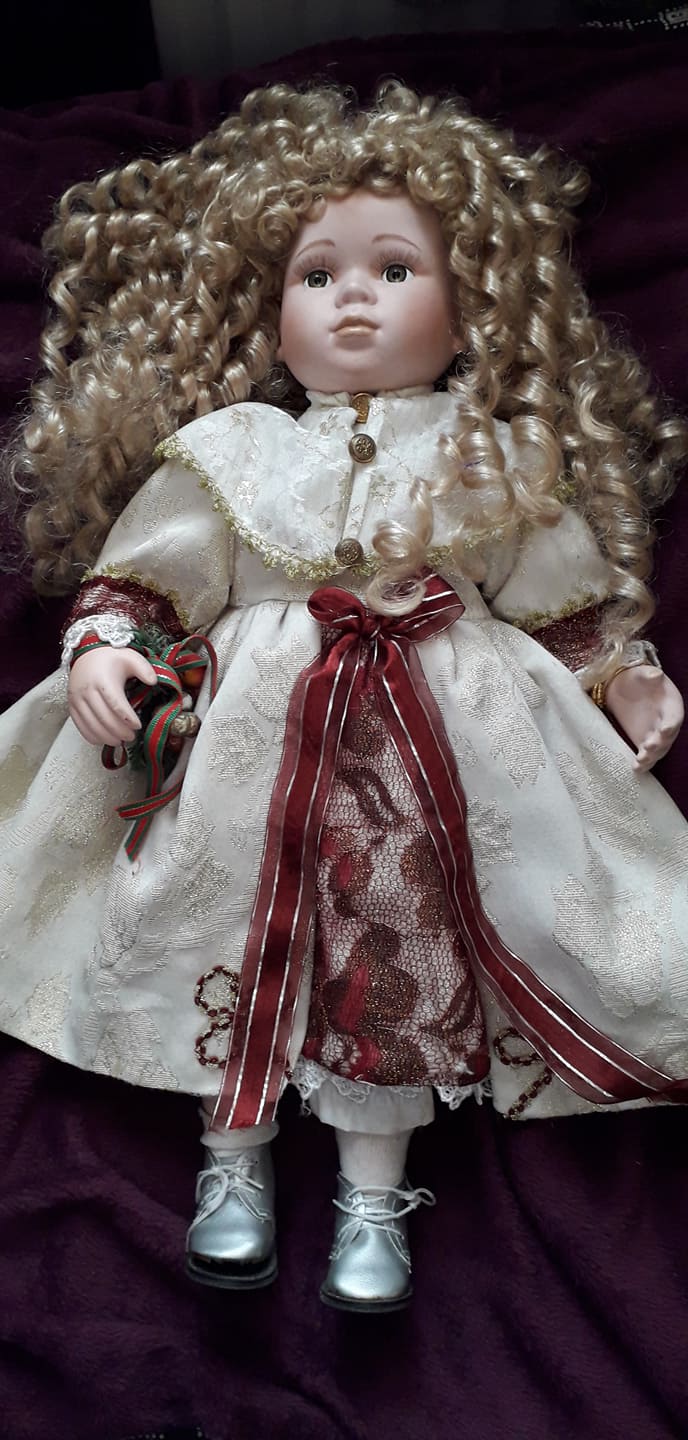 I love them all, but especially Victoria, because she was the first and has magnificent curls. Scarlett Cassandra was so named because her dark green velvet dress reminds me of the gown Scarlett O’Hara makes from her mother’s curtains in Gone With The Wind. She wants a new outfit so she can look her best when she’s visiting Rhett Butler in jail, to ask him to lend her the dough to pay the taxes on Tara. But to pull down and desecrate Miz Ellen’s portieres… As Mammy might say, t’aint fitting…